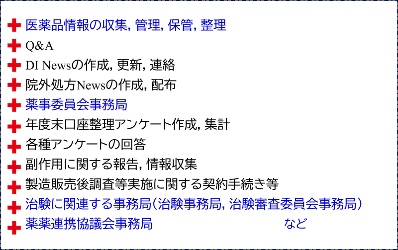 - 病院における経済的管理を含めて医薬品の管理,使用,取り扱いに責任を持ち,事故防止に万全を期す。