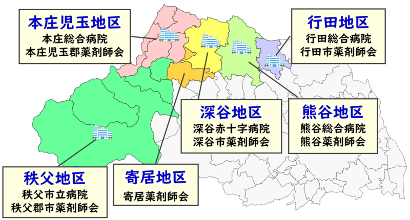 平成23年2月に薬局薬剤師と病院薬剤師との相互理解、相互利益、相互尊重を掲げ、患者に対してより良い医療を提供するための意見交換の場とすることを目的とし、埼玉県北部に位置する行田、熊谷、深谷、本庄児玉、寄居、秩父の各薬剤師会とそれらの地域の中核5病院とで「埼玉県北部薬薬連携協議会」を設立しました。